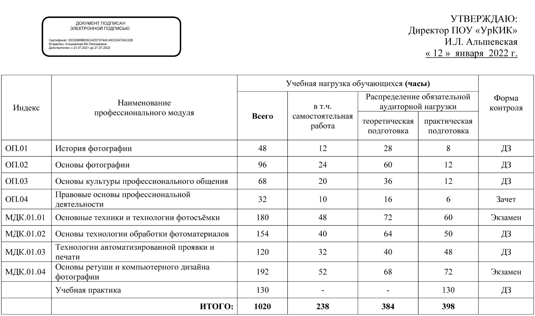 ПЛАН УЧЕБНОГО ПРОЦЕССА "ИСКУССТВО ФОТОГРАФИИ"