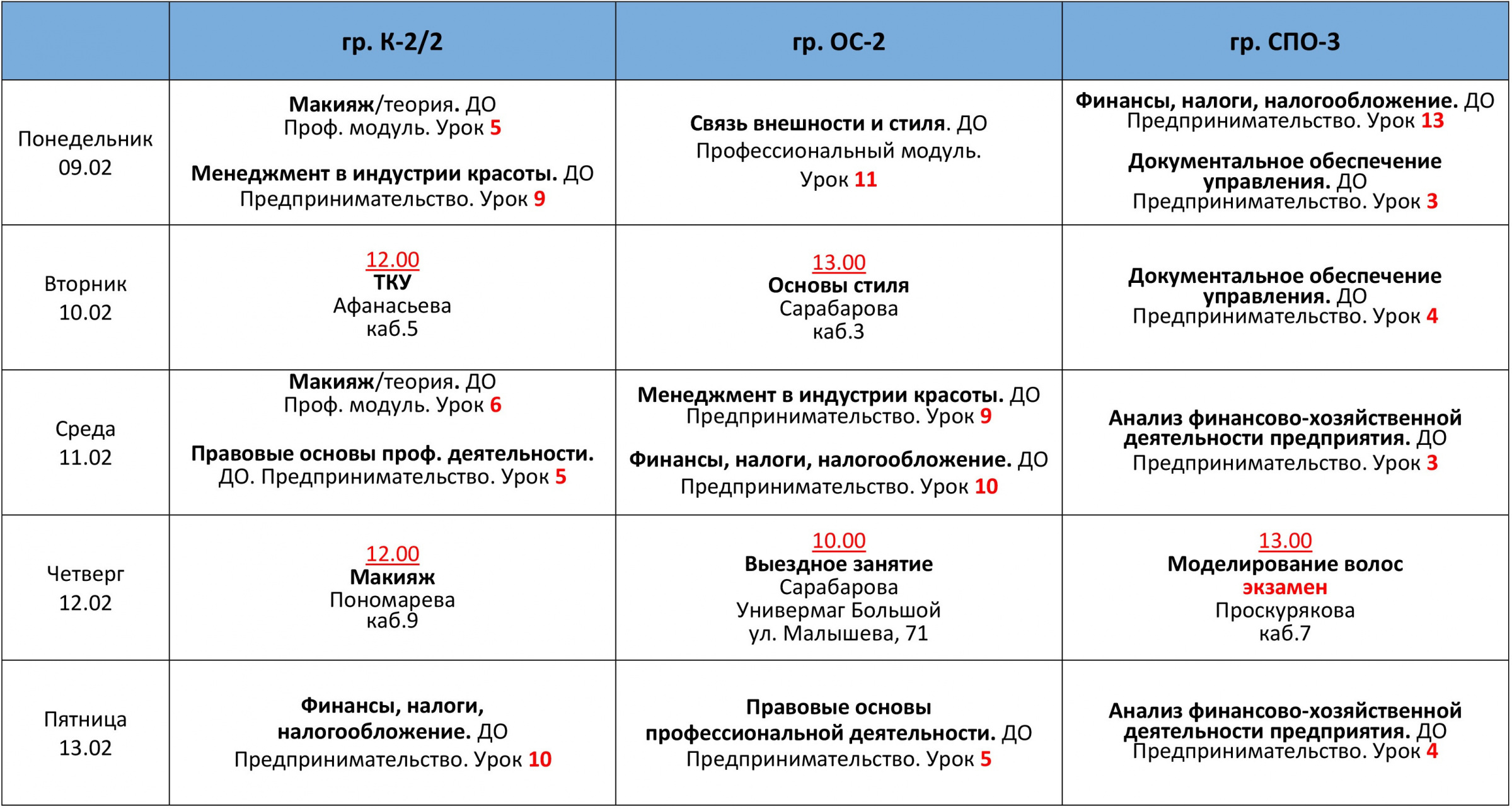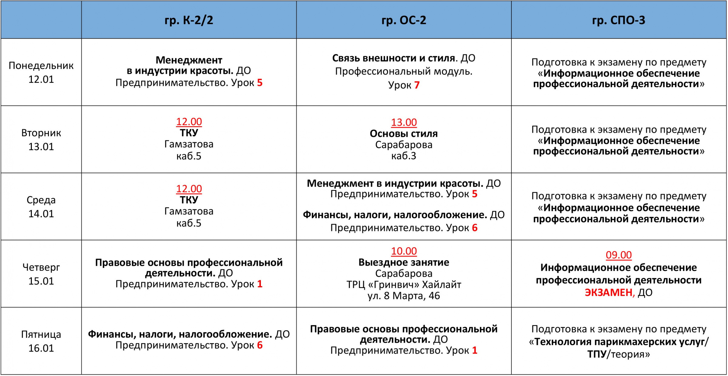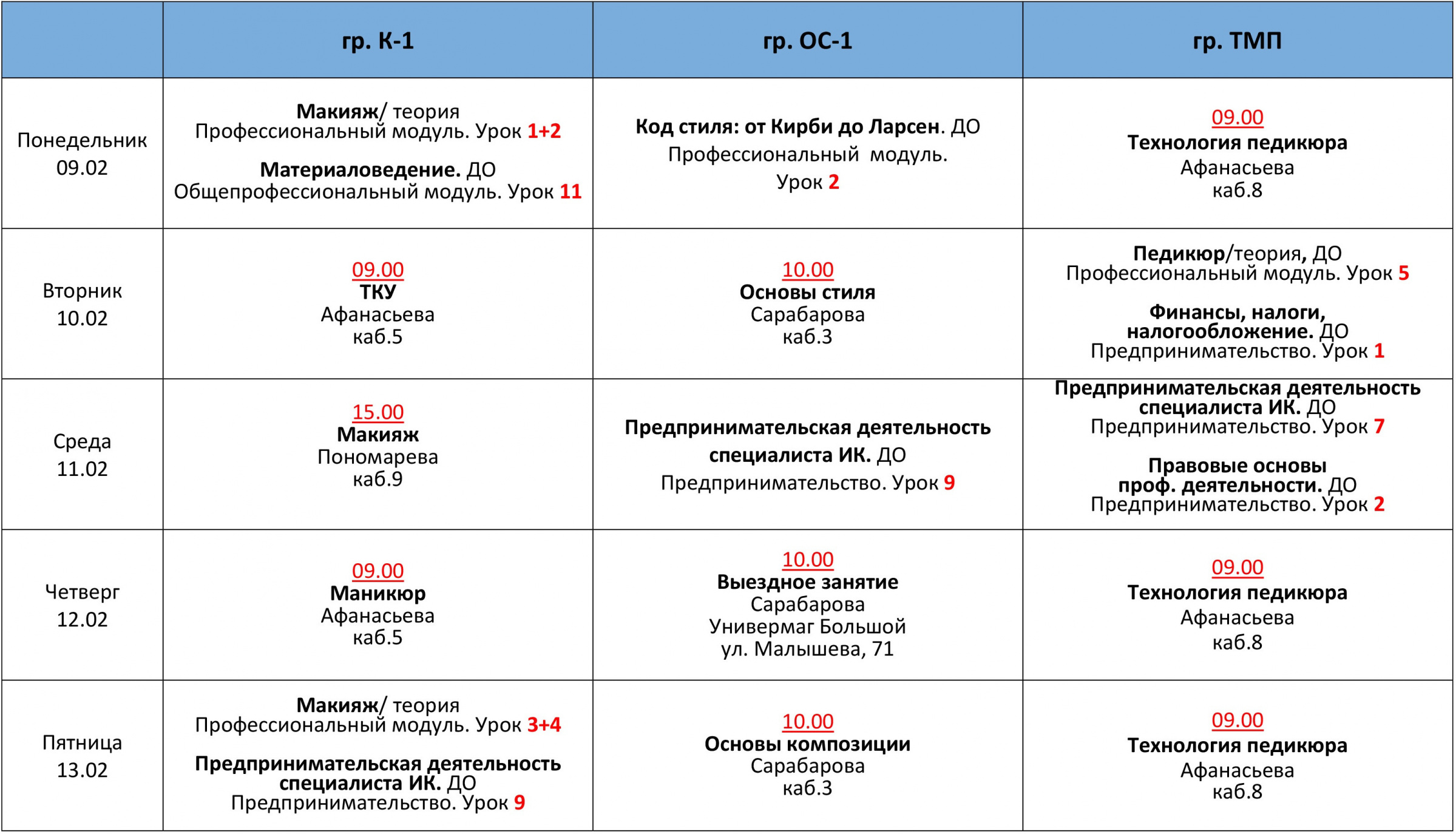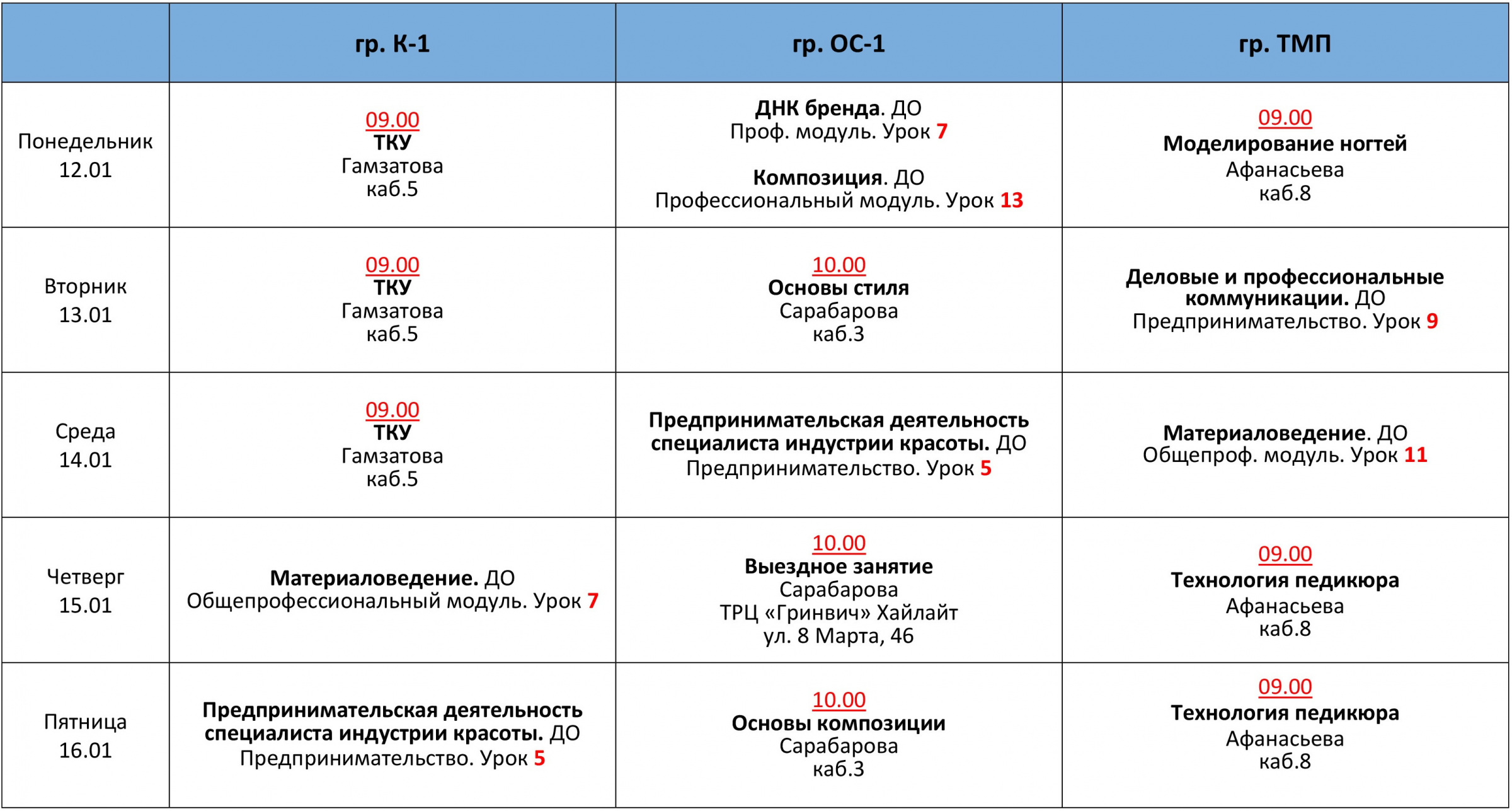 РАСПИСАНИЕ ЗАНЯТИЙ